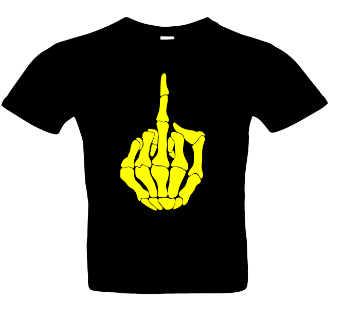 Dieses T-Shirt gibt es mit dem Aufdruck eines Skelett Stinkefinger.
