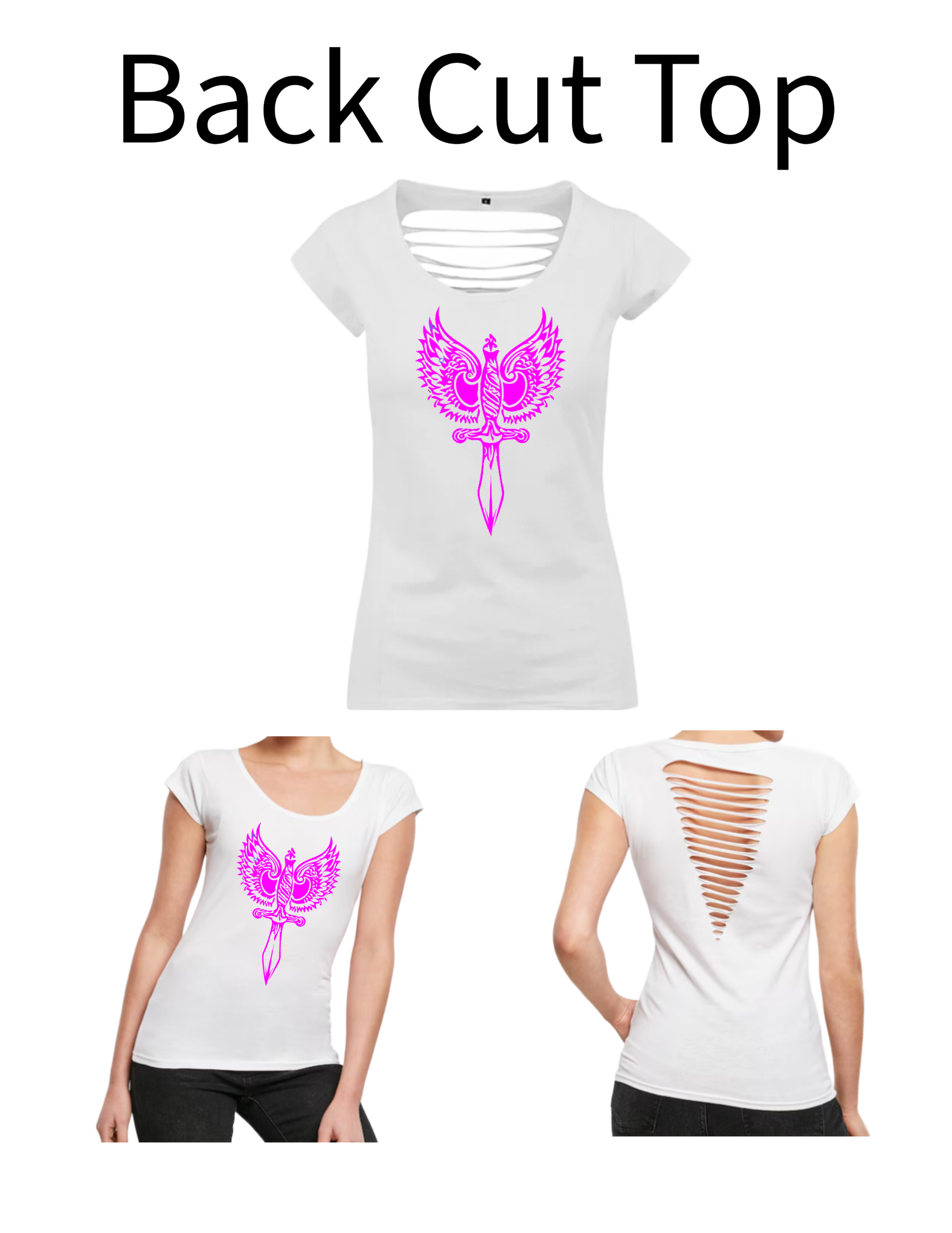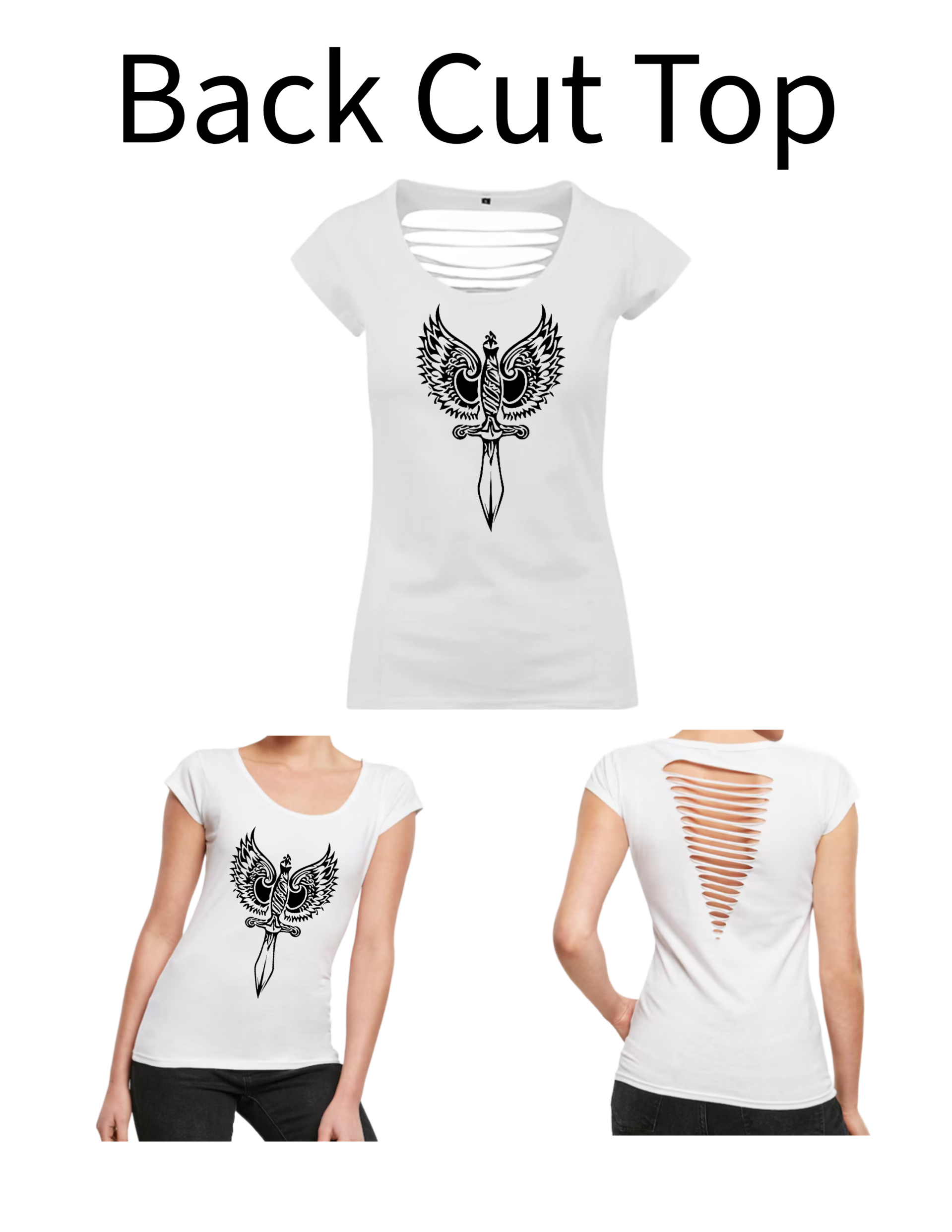 Dieses Back Cut Top wir mit einem Aufdruck verkauft. Das Motiv in diesem Fall ist ein Dolch.
