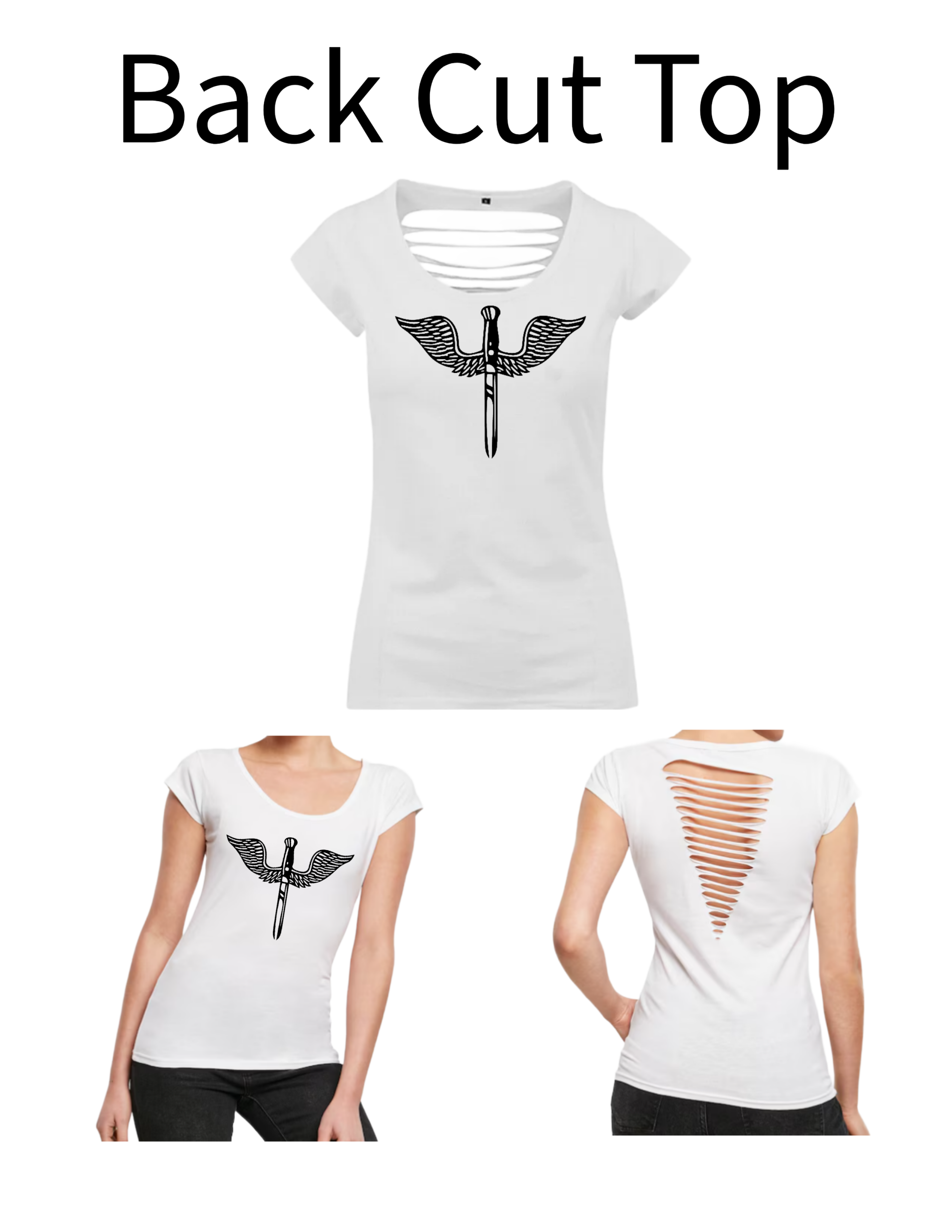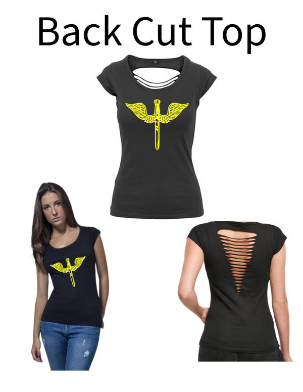 Dieses Back Cut Top wir mit einem Aufdruck verkauft. Das Motiv in diesem Fall ist ein Dolch.