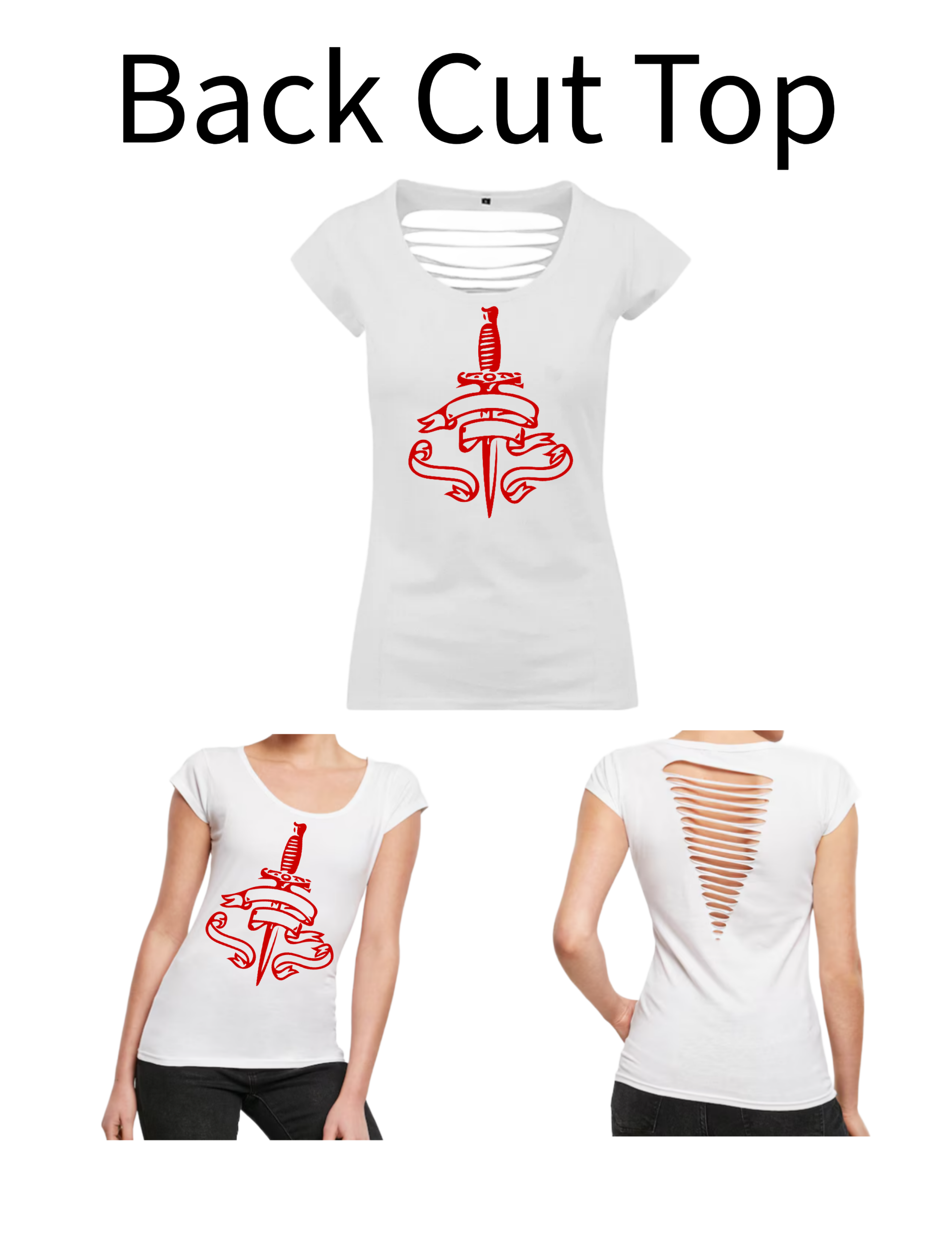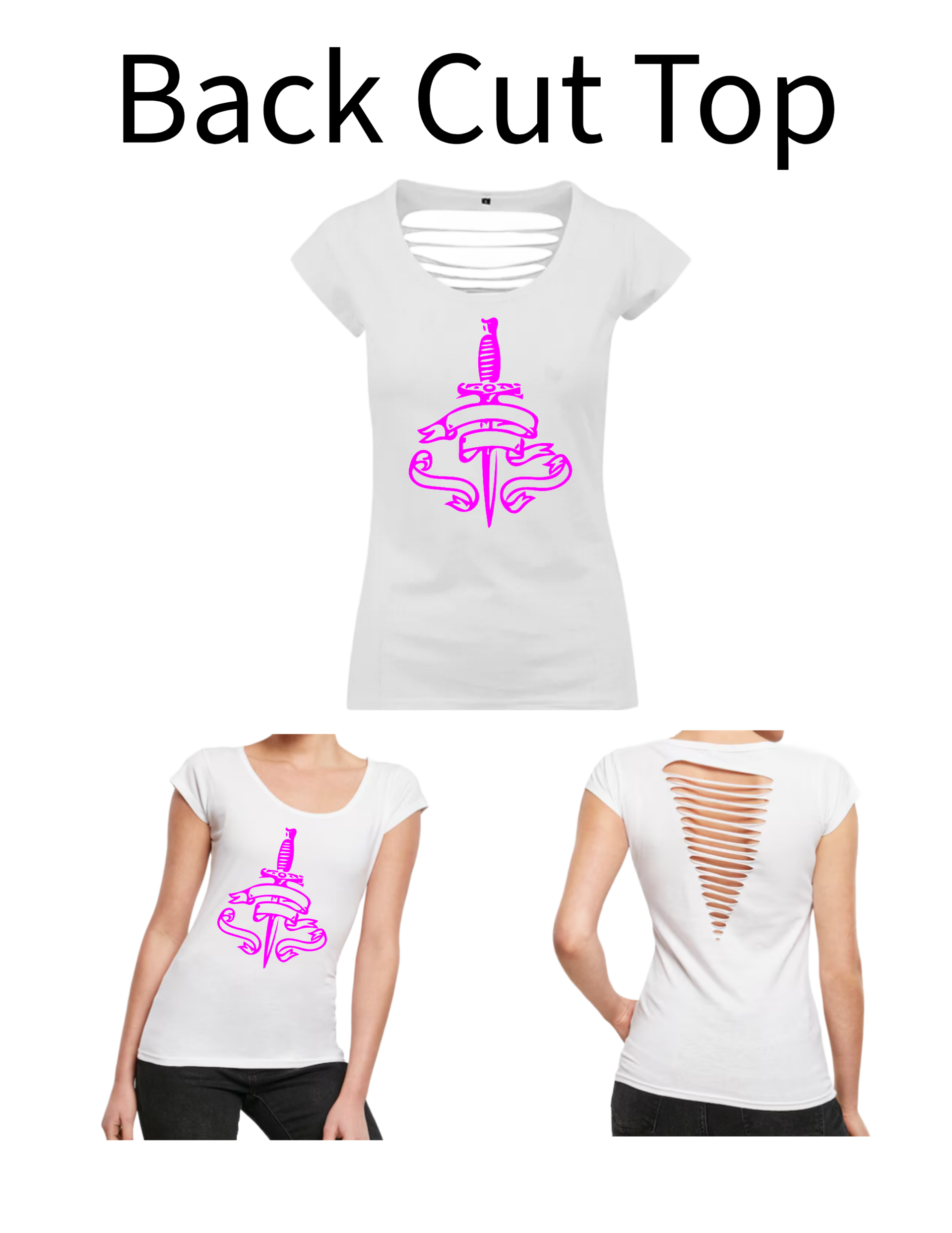 Dieses Back Cut Top wir mit einem Aufdruck verkauft. Das Motiv in diesem Fall ist ein Dolch.