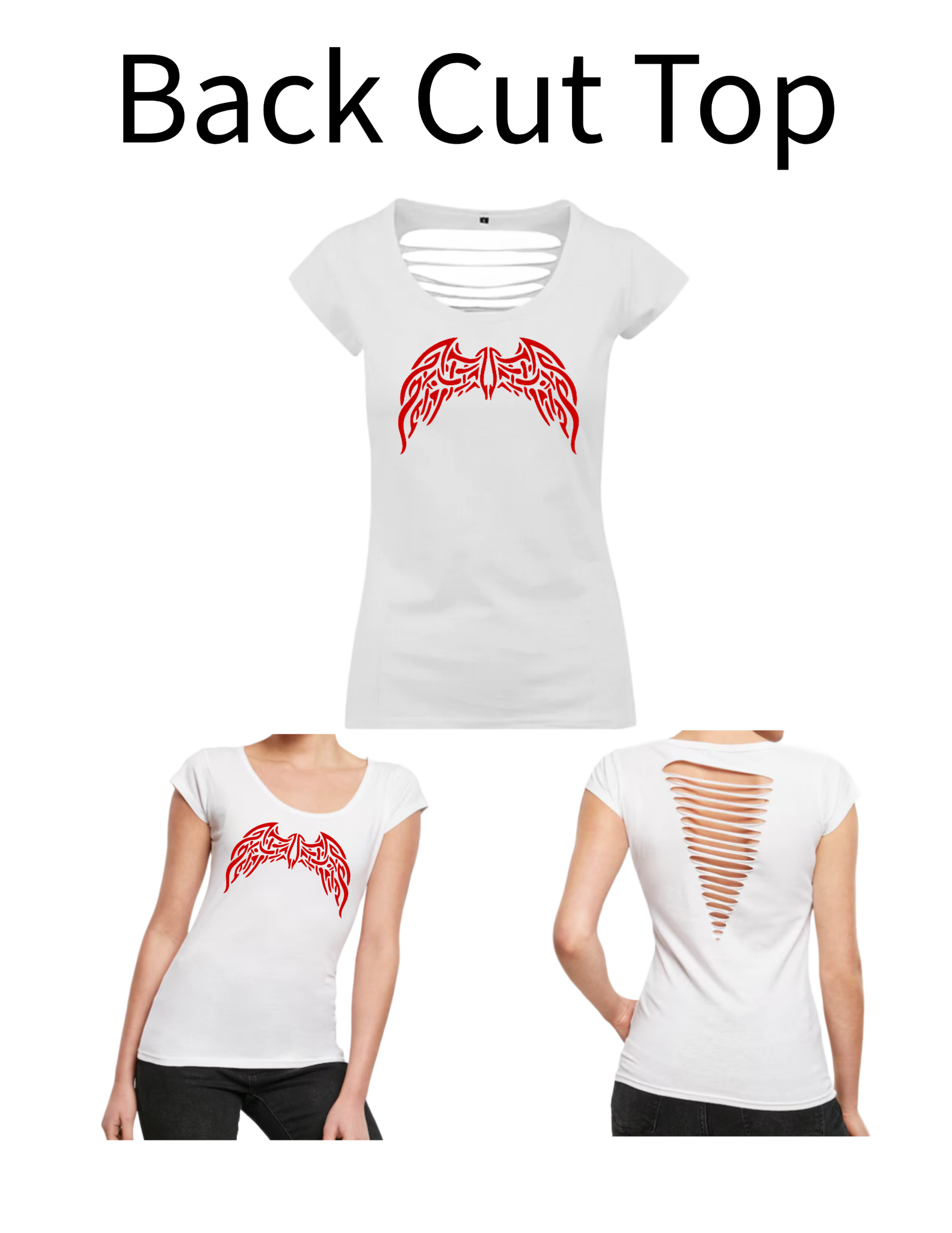 Dieses Back Cut Top wir mit einem Aufdruck verkauft. Das Motiv in diesem Fall ist ein Engelsflügel.