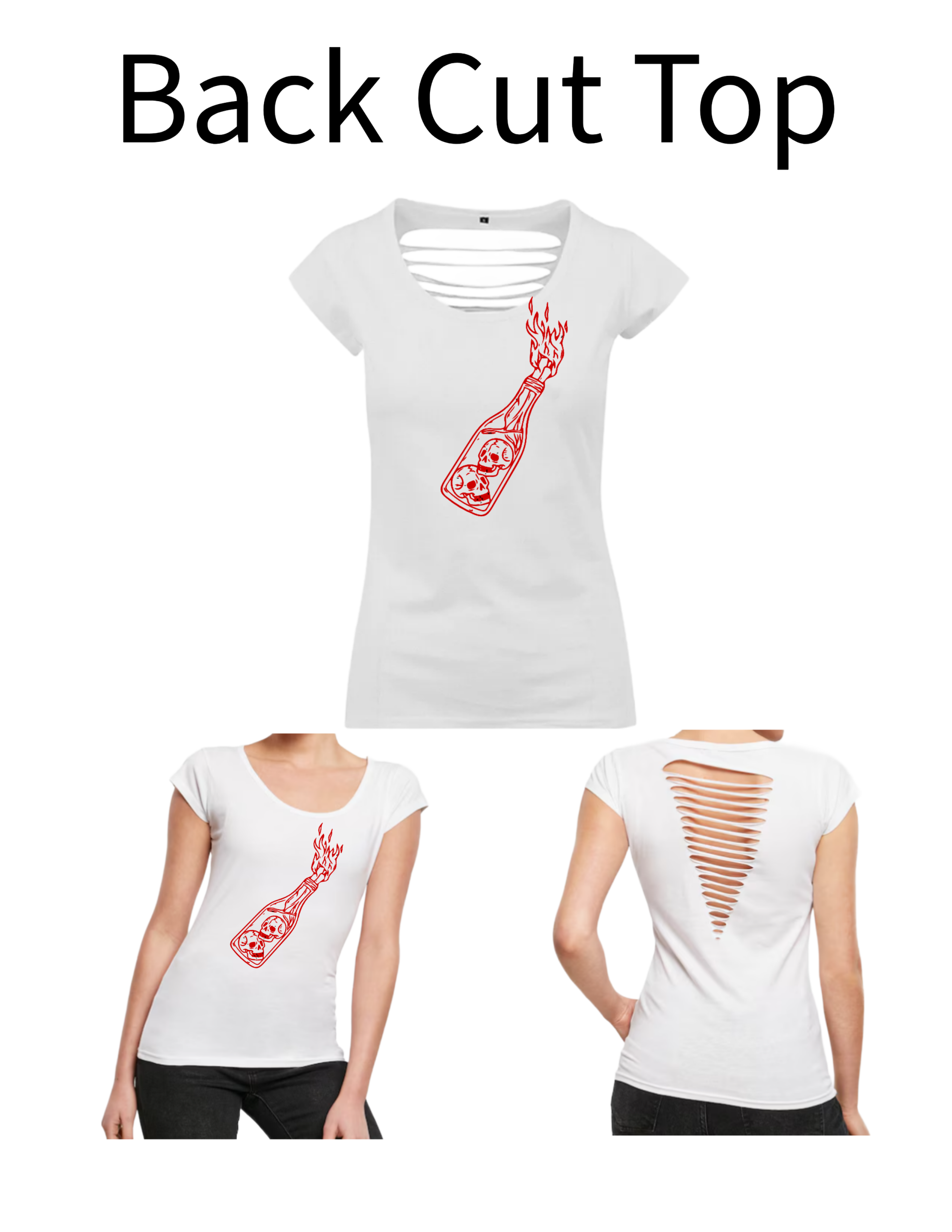 Dieses Back Cut Top wir mit einem Aufdruck verkauft. Das Motiv in diesem Fall ist eine Flasche.