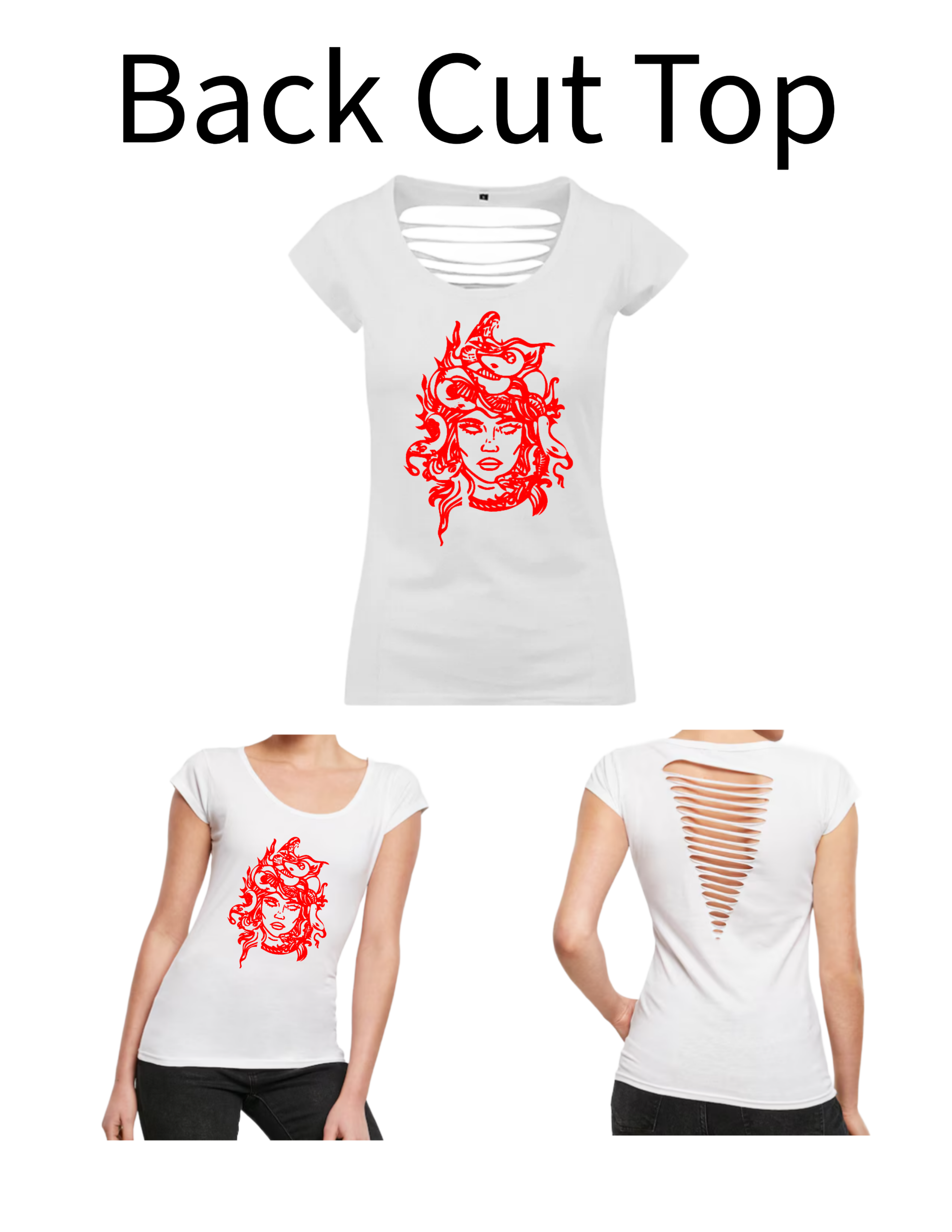Dieses Back Cut Top wir mit einem Aufdruck verkauft. Das Motiv in diesem Fall ist eine Frau mit Schlange.