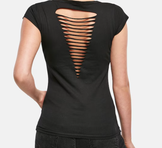 Das Back Cut Top hat einen Rundhals Ausschnitt und liegt sehr gut auf der Haut auf. Auf dem Rücken befinden sich Schlitze und man sieht ein Teil vom Rücken.