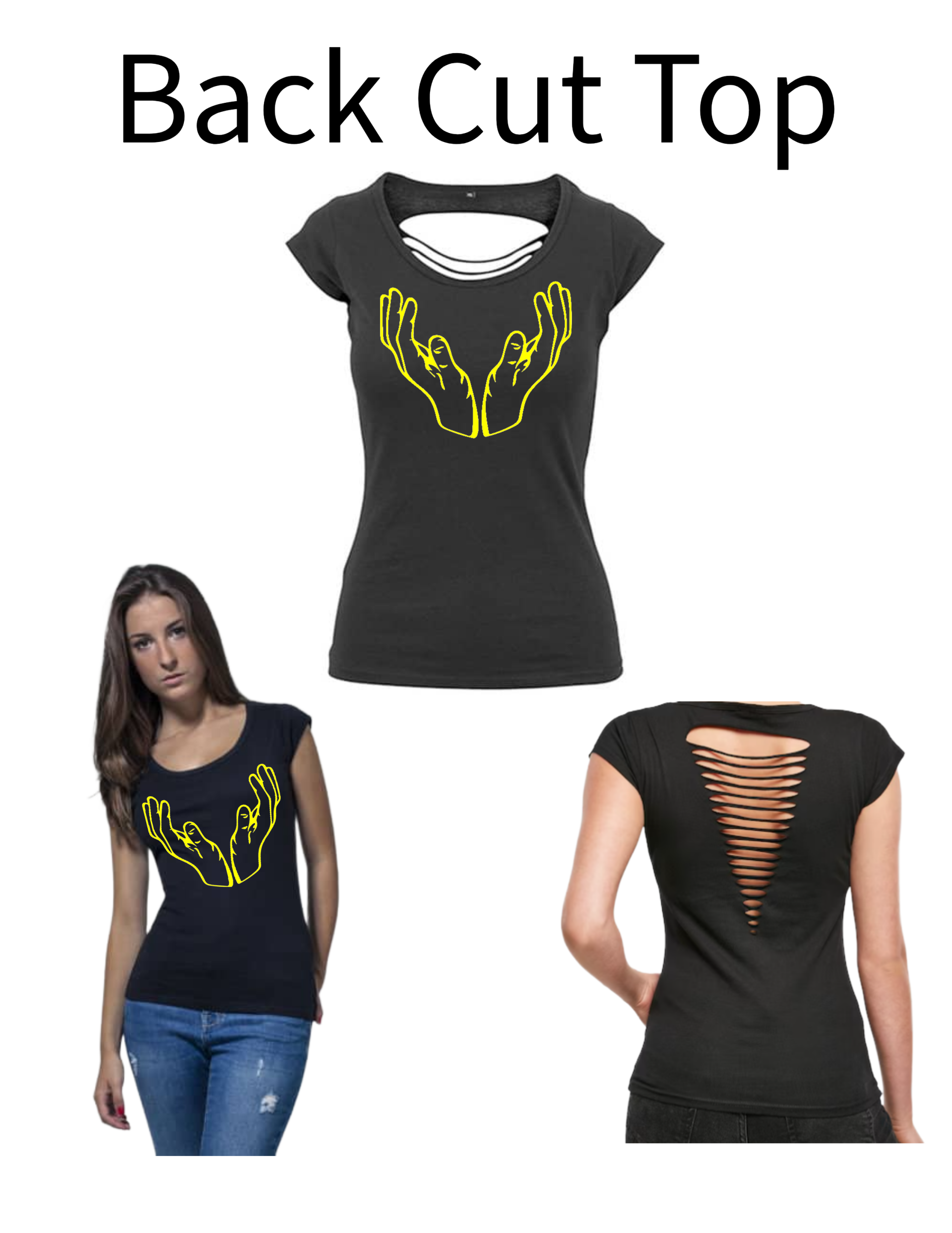 Dieses Back Cut Top wir mit einem Aufdruck verkauft. Das Motiv in diesem Fall ist eine Hand.