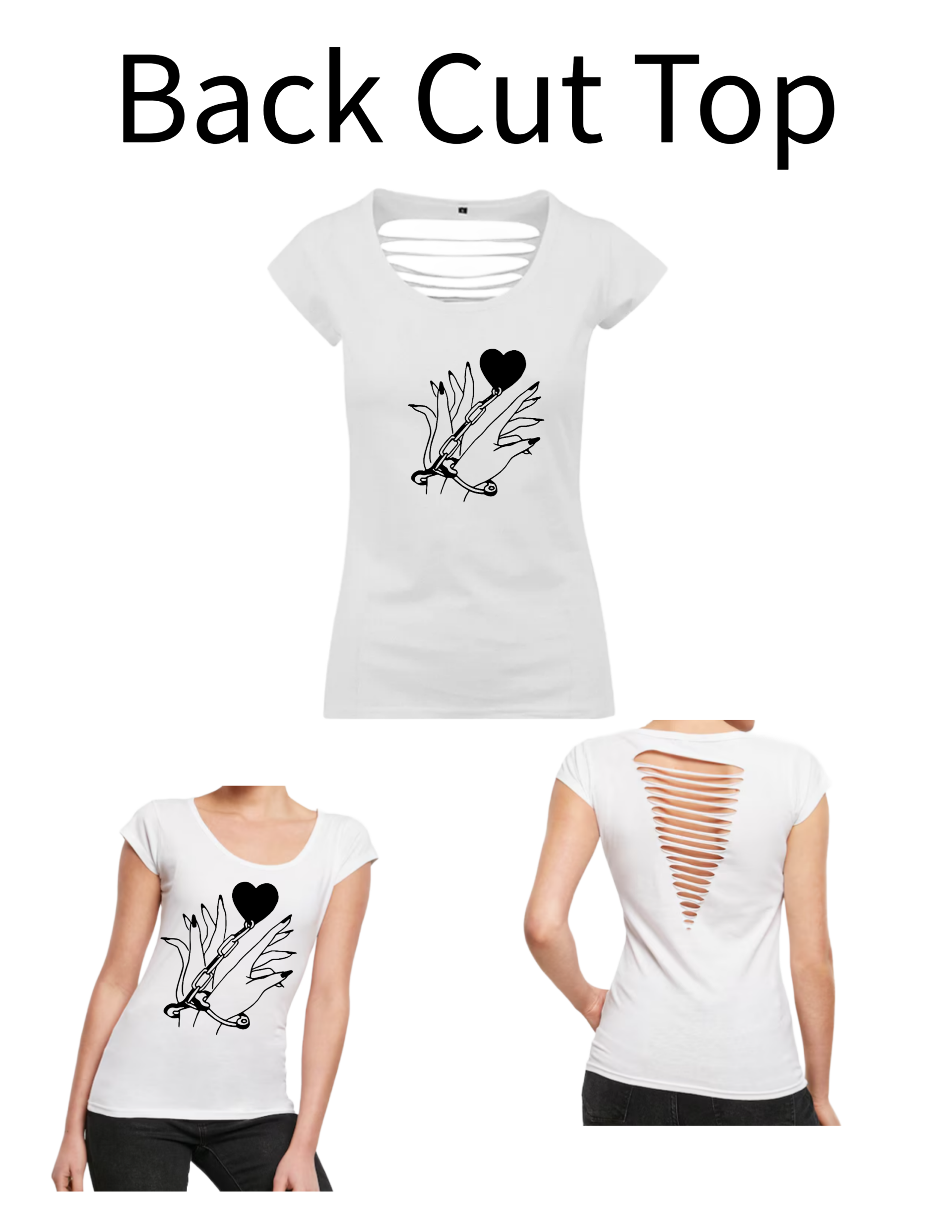 Dieses Back Cut Top wir mit einem Aufdruck verkauft. Das Motiv in diesem Fall ist eineine Hand mit Hanschellen.