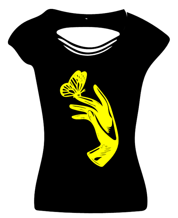 Dieses Back Cut Top wir mit einem Aufdruck verkauft. Das Motiv in diesem Fall ist eine Hand mit Schmetterling.