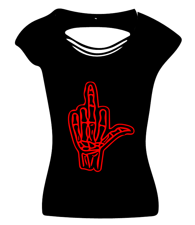 Dieses Back Cut Top wir mit einem Aufdruck verkauft. Das Motiv in diesem Fall ist ein Skelett Stinkefinger