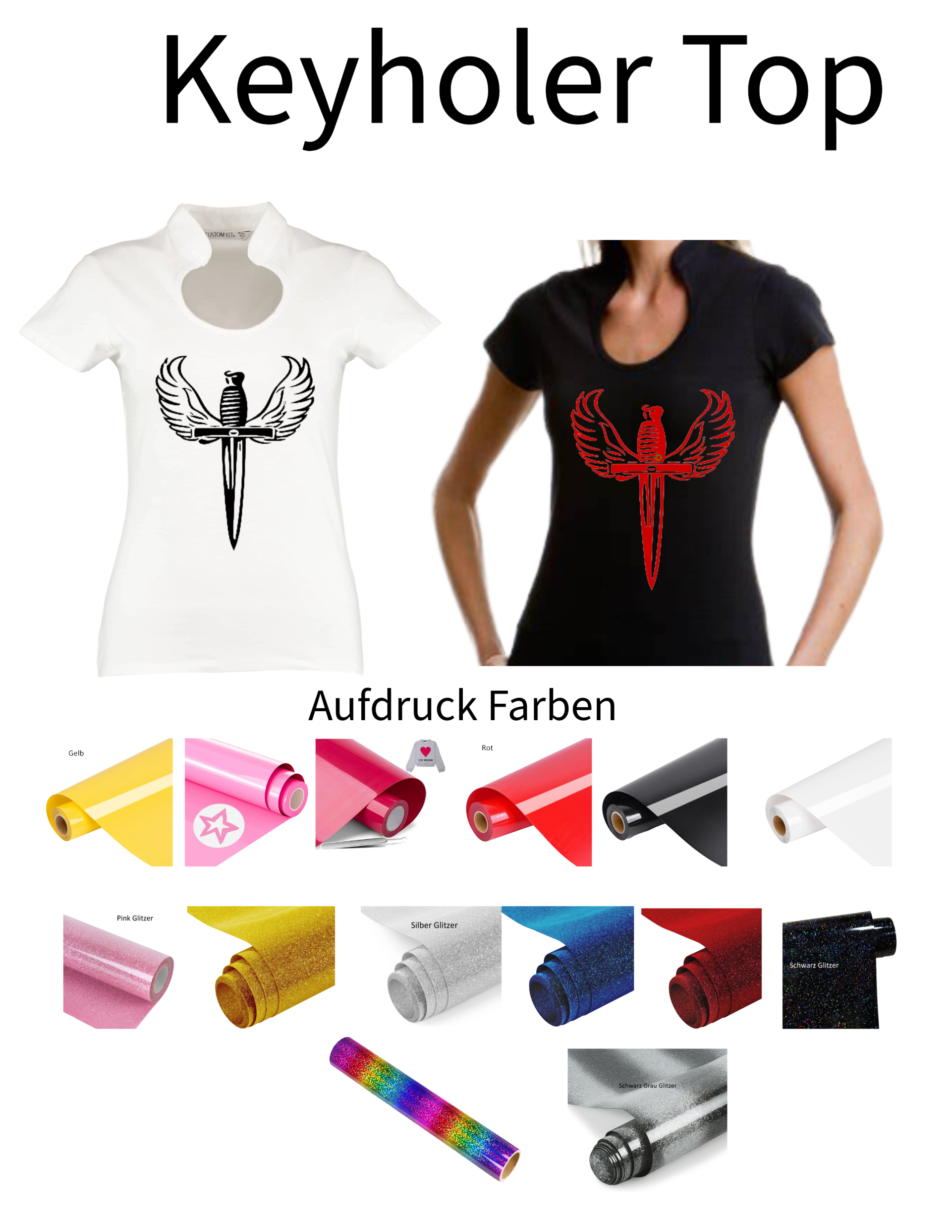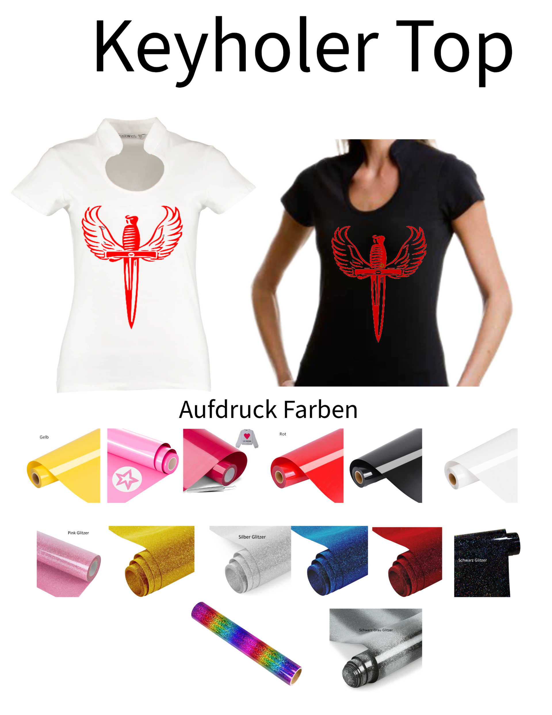 Dieses Corporate Top Keyhole wird mit einem Aufdruck verkauft. Das Motiv in diesem Fall ist ein Dolch.