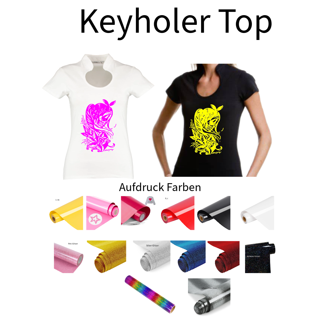 Dieses Corporate Top Keyhole wird mit einem Aufdruck verkauft. Das Motiv in diesem Fall ist ein Frau.