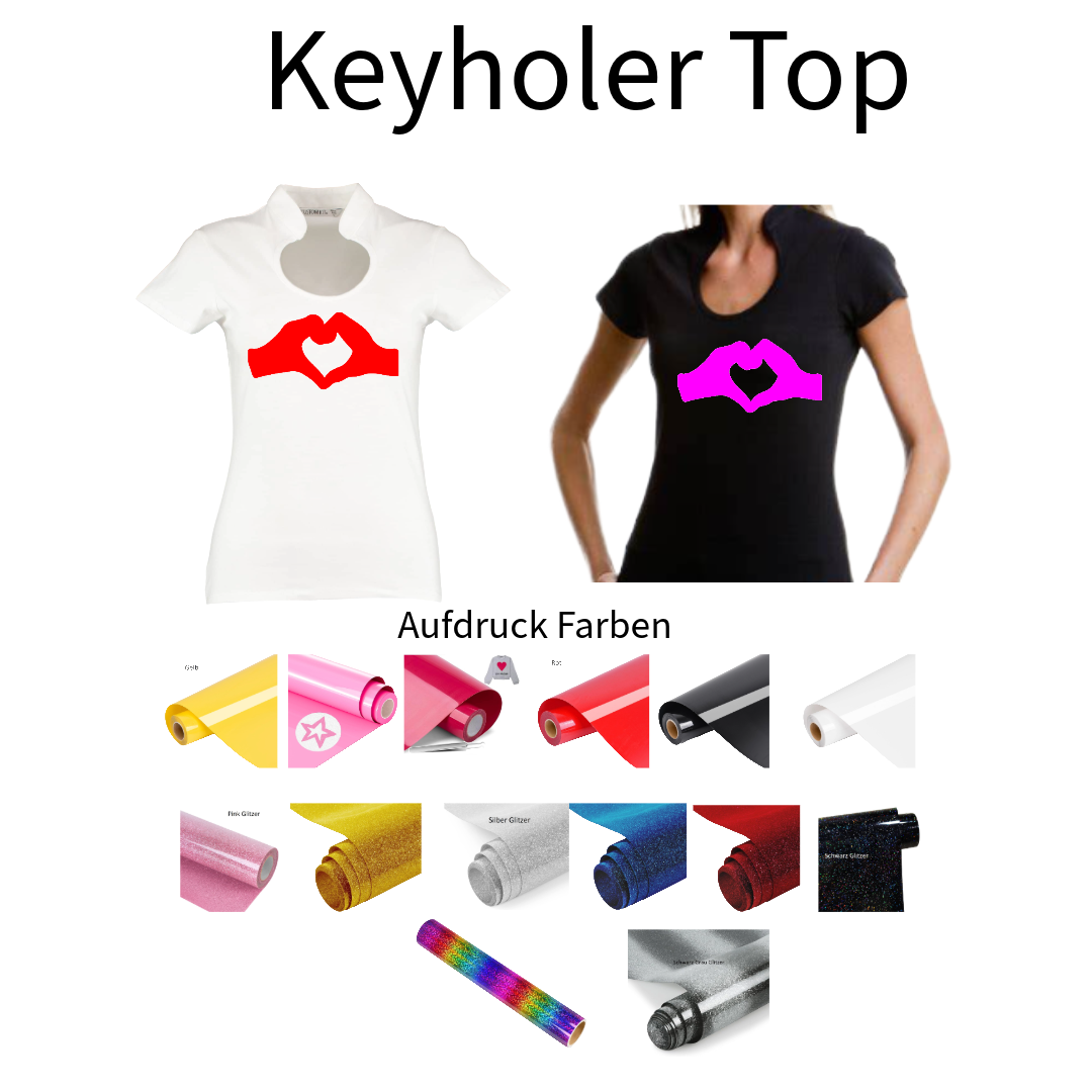Dieses Corporate Top Keyhole wird mit einem Aufdruck verkauft. Das Motiv in diesem Fall ist ein Hand mit Herz.