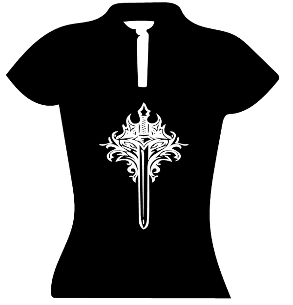 Dieses Corporate Top Keyhole wird mit einem Aufdruck verkauft. Das Motiv in diesem Fall ist ein Schwert.