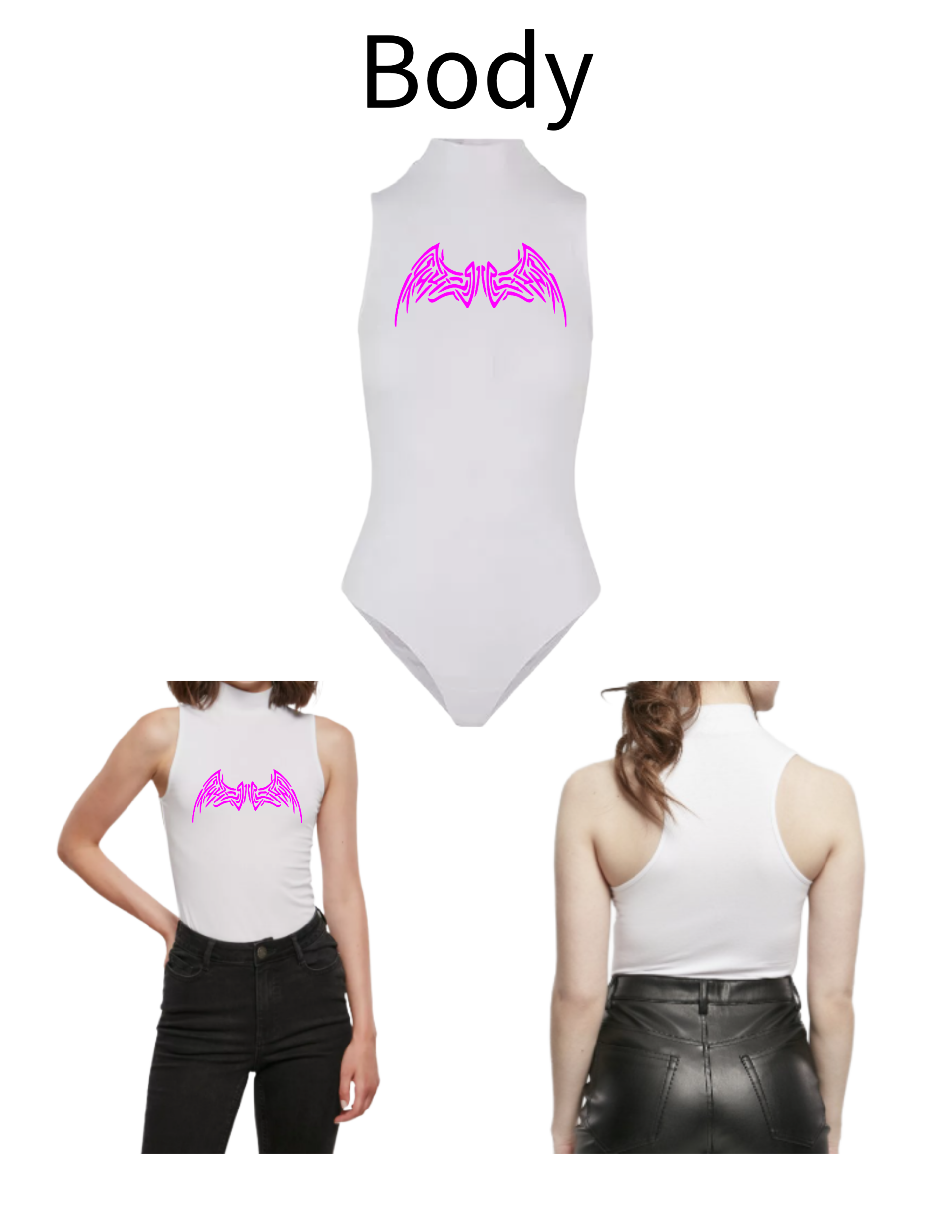 Der Aufdruck fängt an der Hüfte an und wird der jeweiligen Größe des Bodys Angepasst. Dieses Body mit denn Mustern / Motiven / Schriftzug kann dadurch getragen werden. Ab der hüfte sitzt die Hose oder der Rock und ist daher Bedeckt. Es wird zwischen den Beinen mit 3 Druckknöpfen geschlossen. Mit dem Body braucht man auch kein weiteres Oberteil. Es liegt an der Haut sehr gut an und formt das Aussehen.