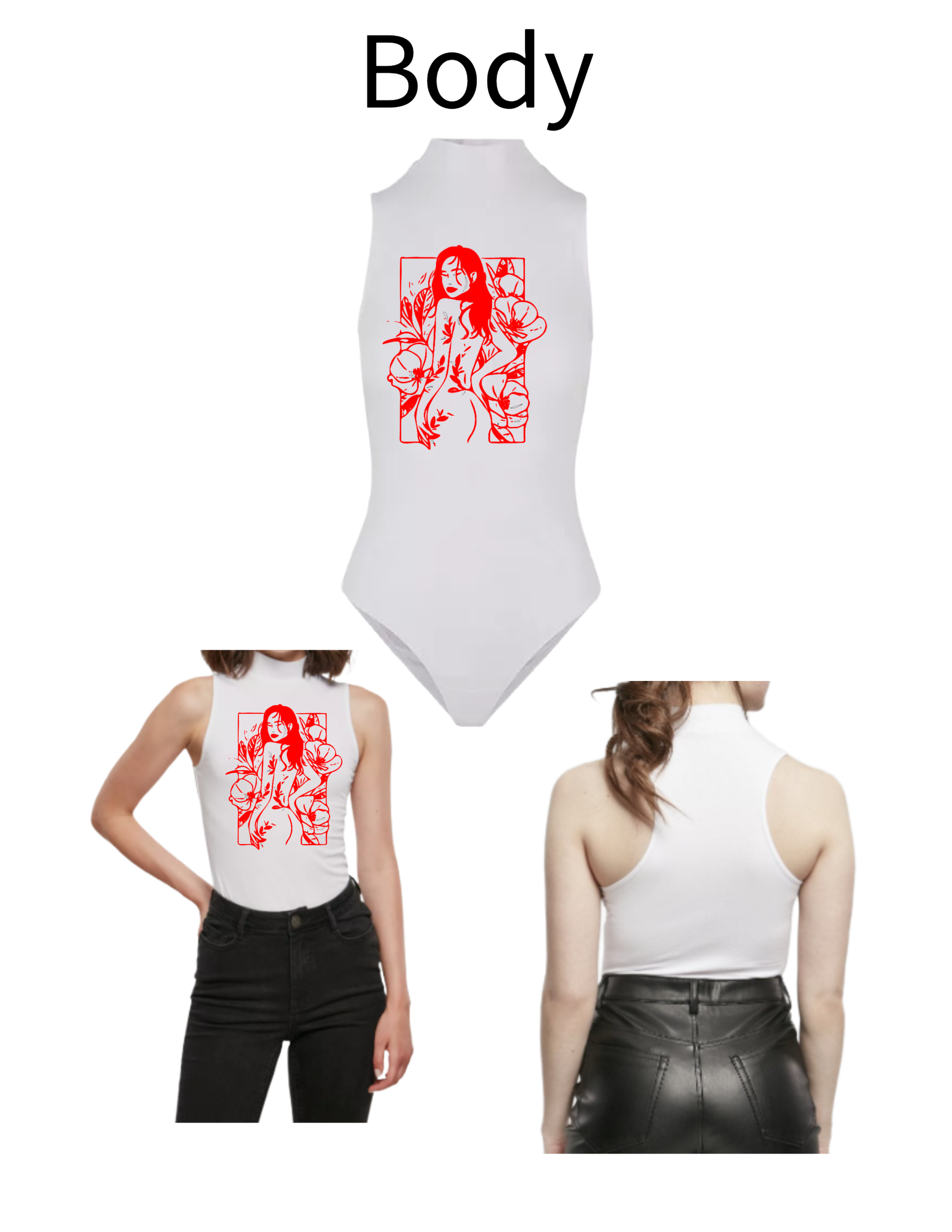 Der Aufdruck fängt an der Hüfte an und wird der jeweiligen Größe des Bodys Angepasst. Dieses Body mit denn Mustern / Motiven / Schriftzug kann dadurch getragen werden. Ab der hüfte sitzt die Hose oder der Rock und ist daher Bedeckt. Es wird zwischen den Beinen mit 3 Druckknöpfen geschlossen. Mit dem Body braucht man auch kein weiteres Oberteil. Es liegt an der Haut sehr gut an und formt das Aussehen.