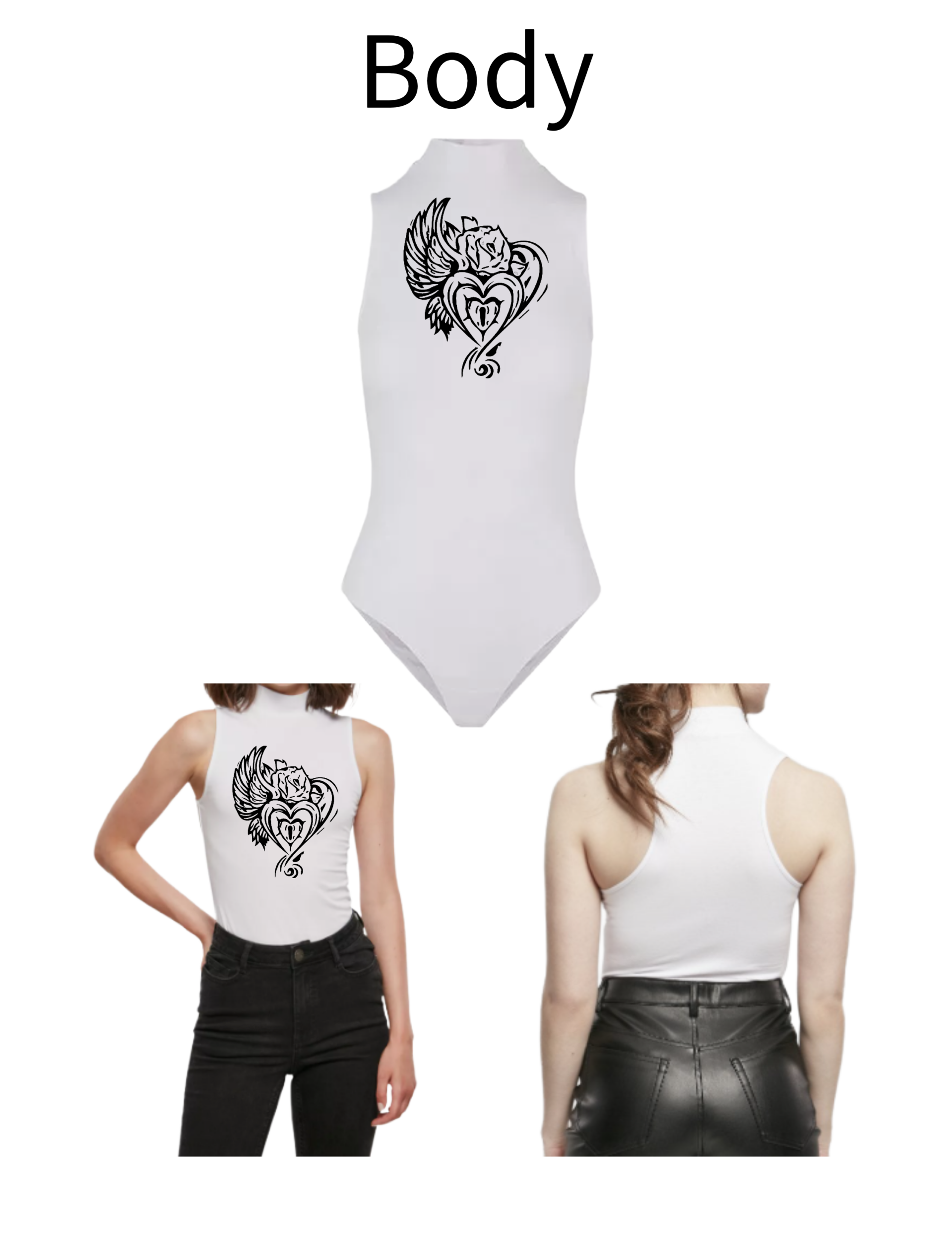 Der Aufdruck fängt an der Hüfte an und wird der jeweiligen Größe des Bodys Angepasst. Dieses Body mit denn Mustern / Motiven / Schriftzug kann dadurch getragen werden. Ab der hüfte sitzt die Hose oder der Rock und ist daher Bedeckt. Es wird zwischen den Beinen mit 3 Druckknöpfen geschlossen. Mit dem Body braucht man auch kein weiteres Oberteil. Es liegt an der Haut sehr gut an und formt das Aussehen.