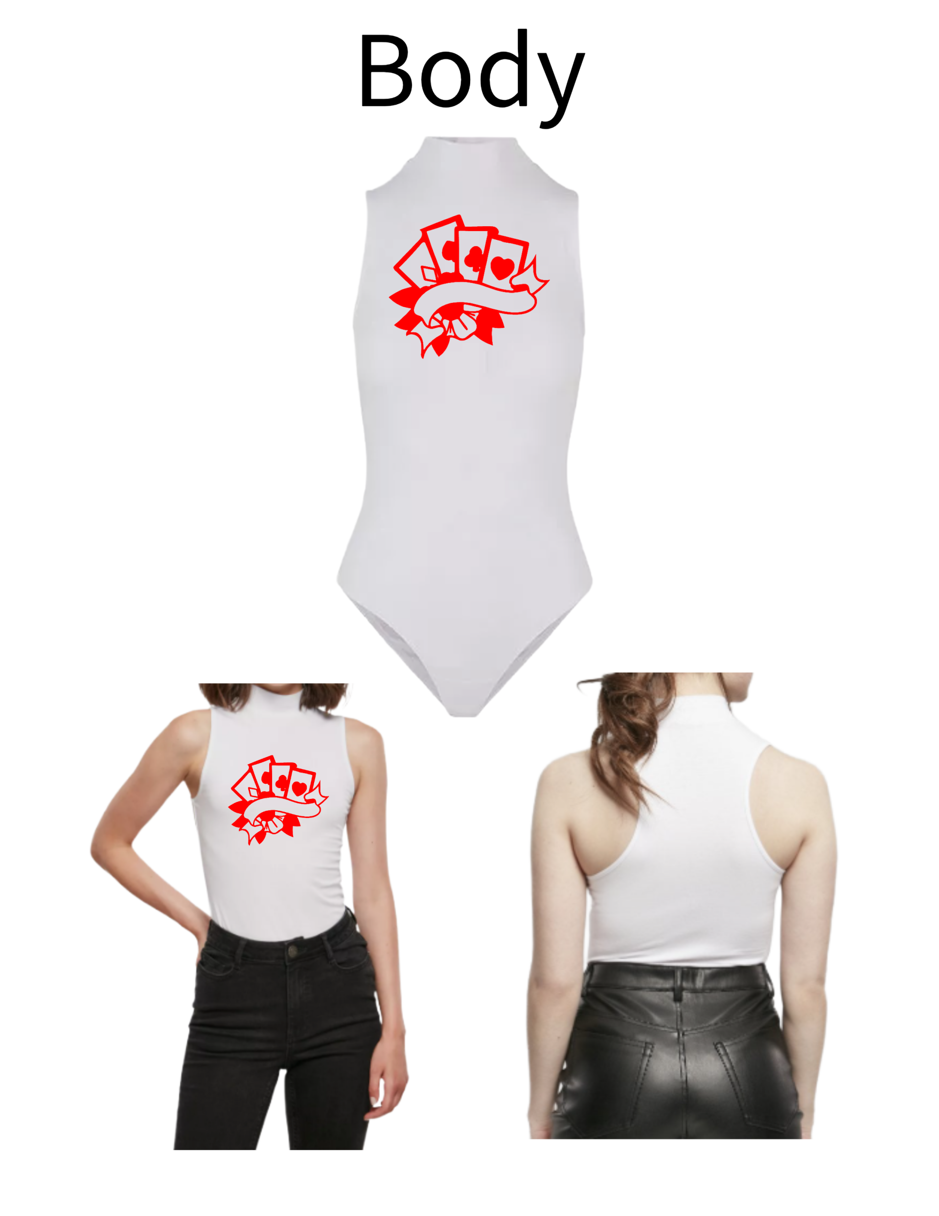 Der Aufdruck fängt an der Hüfte an und wird der jeweiligen Größe des Bodys Angepasst. Dieses Body mit denn Mustern / Motiven / Schriftzug kann dadurch getragen werden. Ab der hüfte sitzt die Hose oder der Rock und ist daher Bedeckt. Es wird zwischen den Beinen mit 3 Druckknöpfen geschlossen. Mit dem Body braucht man auch kein weiteres Oberteil. Es liegt an der Haut sehr gut an und formt das Aussehen.