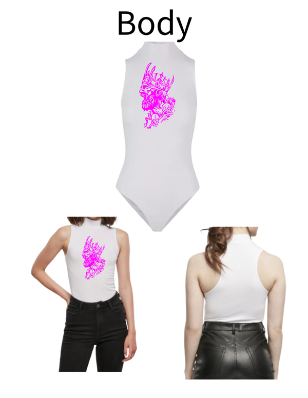 Der Aufdruck fängt an der Hüfte an und wird der jeweiligen Größe des Bodys Angepasst. Dieses Body mit denn Mustern / Motiven / Schriftzug kann dadurch getragen werden. Ab der hüfte sitzt die Hose oder der Rock und ist daher Bedeckt. Es wird zwischen den Beinen mit 3 Druckknöpfen geschlossen. Mit dem Body braucht man auch kein weiteres Oberteil. Es liegt an der Haut sehr gut an und formt das Aussehen.