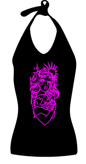 Die Größe des Aufdruck ist Standard mäßig 29 cm x 29 cm. Jenach Motive und Größe des Neckholder Top´s kann es sich auch ändern. Dies ist ein Top von unsere Kollektion und wird mit einem Selbsthergestellten Aufdruck Bedruckt. Dieser Druck wird entweder Farbig gedruckt oder Einfarbig geplottet. Und wird dann mittels einer Transferpresse mit dem Top Verschmolzen. Auf Wunsch können wir das Motiv auch auf eure Größe anpassen. Dafür kontaktieren sie uns bitte.