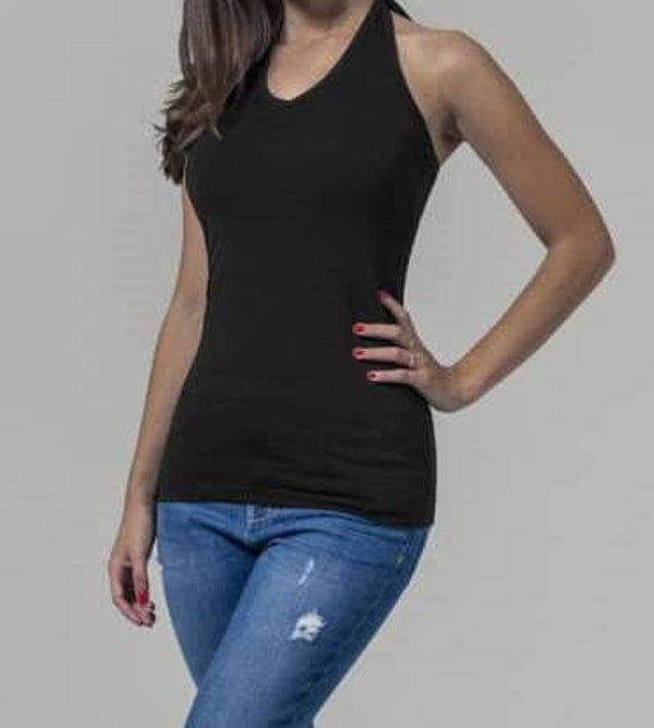 Unser Neckholder Top liegt am körper sehr gut an und wird um denn Hals gebunden. Da es um denn Halsgebunden wird, ist es wunderbar anzupassen. Der oberer Rückenbereich ist frei.